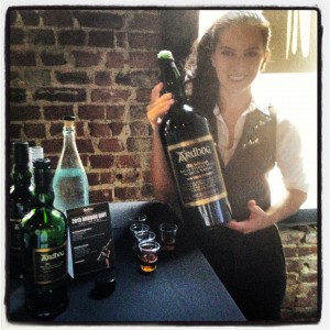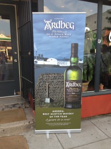 **Picture Credits and Details: Picture 1 ;??Ardbog dram, photo courtesy of Anthony Rivera. Picture 2; Ardbog Welcome Banner outside of A&D June 2013. ?Picture 3; Arleigh, bartender and Harvey Frey, Scotch Consultant both representing Jack Rose Dining Saloon at Ardbog Day. Picture 4; ?Ardbog Tasting Table at the event.